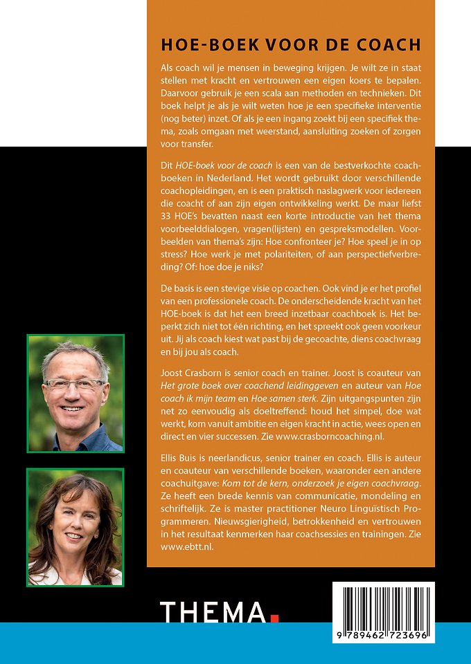 Dit HOE-boek voor de coach is een van de bestverkochte coachboeken in Nederland. Het wordt gebruikt door verschillende coachopleidingen, en is een praktisch naslagwerk voor iedereen die coacht of aan zijn eigen ontwikkeling werkt. De maar liefst 33 HOE’s bevatten naast een korte introductie van het thema voorbeelddialogen, vragen(lijsten) en gespreksmodellen. Voorbeelden van thema’s zijn: Hoe confronteer je? Hoe speel je in op stress? Hoe werk je met polariteiten, of aan perspectiefverbreding? Of: hoe doe je niks?