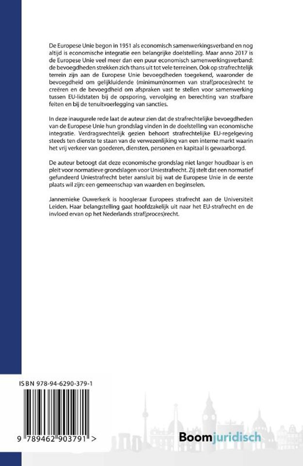 In deze inaugurele rede laat de auteur zien dat de strafrechtelijke bevoegdheden van de Europese Unie hun grondslag vinden in de doelstelling van economische integratie. Verdragsrechtelijk gezien behoort strafrechtelijke EU-regelgeving steeds ten dienste te staan van de verwezenlijking van een interne markt waarin het vrij verkeer van goederen, diensten, personen en kapitaal is gewaarborgd.