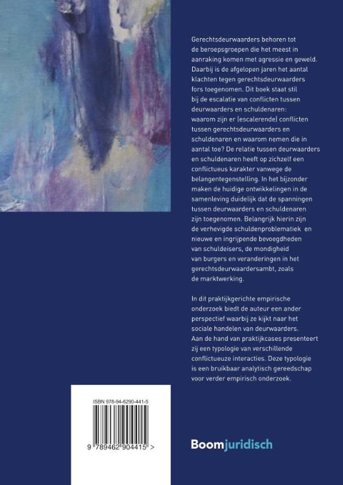 Gerechtsdeurwaarders behoren tot de beroepsgroepen die het meest in aanraking komen met agressie en geweld. Daarbij is de afgelopen jaren het aantal klachten tegen gerechtsdeurwaarders fors toegenomen. Dit boek staat stil bij de escalatie van conflicten tussen deurwaarders en schuldenaren: Waarom zijn er (escalerende) conflicten tussen gerechtsdeurwaarders en schuldenaren en waarom nemen die in aantal toe? De relatie tussen deurwaarders en schuldenaren heeft op zichzelf een conflictueus karakter vanwege de belangentegenstelling. In het bijzonder maken de huidige ontwikkelingen in de samenleving duidelijk dat de spanningen tussen deurwaarders en schuldenaren zijn toegenomen. Belangrijk hierin zijn de verhevigde schuldenproblematiek en nieuwe en ingrijpende bevoegdheden van schuldeisers; de mondigheid van burgers en veranderingen in het gerechtsdeurwaardersambt, zoals de marktwerking.