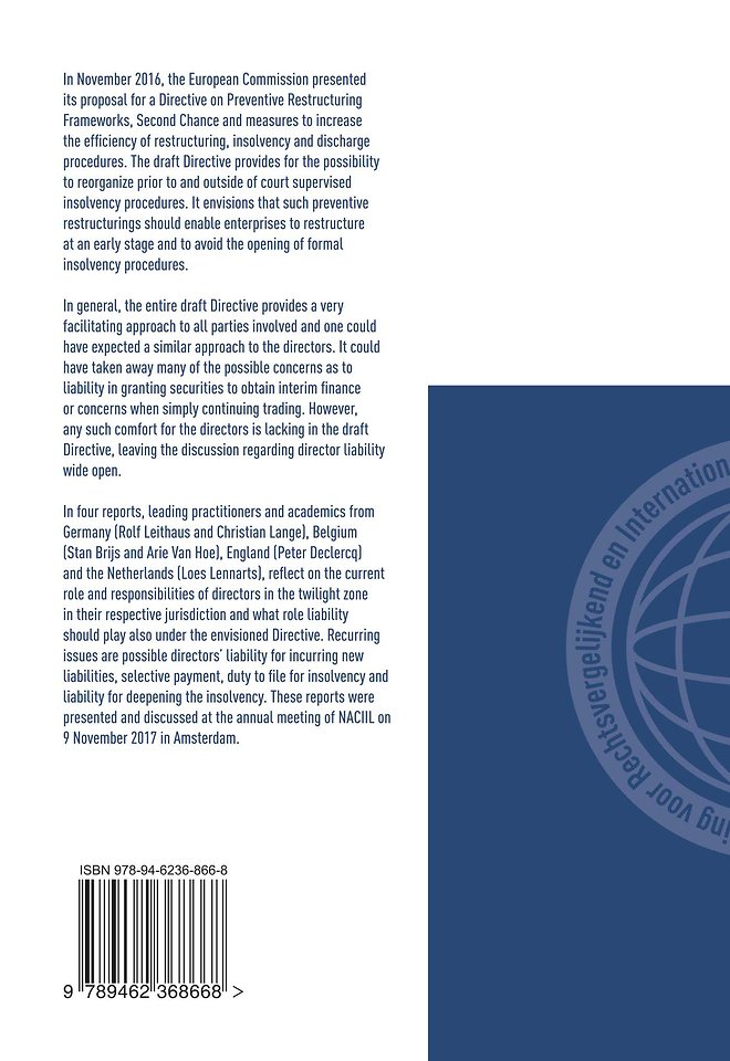 In four reports, leading practitioners and academics from Germany (Rolf Leithaus and Christian Lange), Belgium (Stan Brijs and Arie Van Hoe), England (Peter Declercq) and the Netherlands (Loes Lennarts), reflect on the current role and responsibilities of directors in the twilight zone in their respective jurisdiction and what role liability should play also under the envisioned Directive. Recurring issues are possible directors’ liability for incurring new liabilities, selective payment, duty to file for insolvency and liability for deepening the insolvency. These reports were presented and discussed at the annual meeting of NACIIL on 9 November 2017 in Amsterdam.