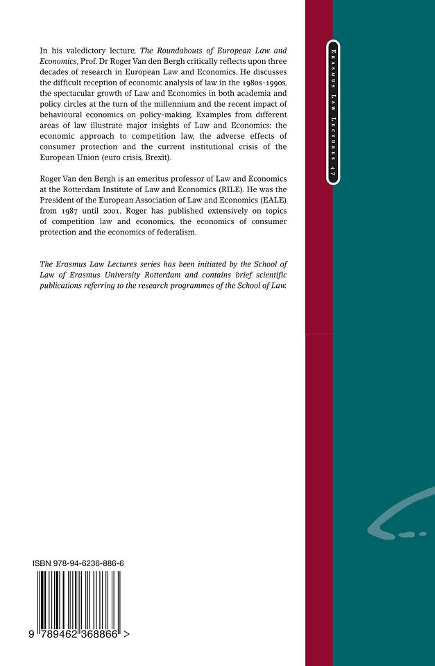 In his valedictory lecture, The Roundabouts of European Law and Economics, Prof. Dr Roger Van den Bergh critically reflects upon three decades of research in European Law and Economics. He discusses the difficult reception of economic analysis of law in the 1980s-1990s, the spectacular growth of Law and Economics in both academia and policy circles at the turn of the millennium and the recent impact of behavioural economics on policy-making. Examples from different areas of law illustrate major insights of Law and Economics: the economic approach to competition law, the adverse effects of consumer protection and the current institutional crisis of the European Union (euro crisis, Brexit).