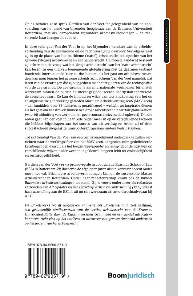 In deze rede gaat Van der Voet in op het bijzondere karakter van de arbeidsverhouding van de zeevarende en de rechtvaardiging daarvoor. Vervolgens gaat zij in op de plaats van het maritieme (‘natte’) arbeidsrecht ten opzichte van het gewone (‘droge’) arbeidsrecht en het handelsrecht. De meeste aandacht besteedt zij echter aan de vraag wat het ‘droge arbeidsrecht’ van het ‘natte arbeidsrecht’ kan leren. In een tijd van toenemende globalisering met de daarmee verband houdende internationale ‘race-to-the-bottom’ als het gaat om arbeidsvoorwaarden, kan men binnen het gewone arbeidsrecht volgens Van der Voet namelijk wat leren van de ervaringen die zijn opgedaan met het reguleren van de rechtspositie van de zeevarende. De zeevarende is als internationale werknemer bij uitstek werkzaam binnen de oudste en meest geglobaliseerde bedrijfstak ter wereld: de zeescheepvaart. Zo kan de inhoud en wijze van totstandkoming van het op 20 augustus 2013 in werking getreden Maritiem Arbeidsverdrag 2006 (MAV 2006) – dat inmiddels door 88 lidstaten is geratificeerd – wellicht tot inspiratie dienen als het gaat om het streven binnen het ‘droge arbeidsrecht’ naar ‘fair globalization’ (waarbij uitbuiting van werknemers geen concurrentievoordeel oplevert). Om die reden gaat Van der Voet in haar rede onder meer in op de verschillende factoren die hebben bijgedragen aan het succes van dit verdrag en beziet zij of deze succesfactoren mogelijk te transporteren zijn naar andere bedrijfstakken.