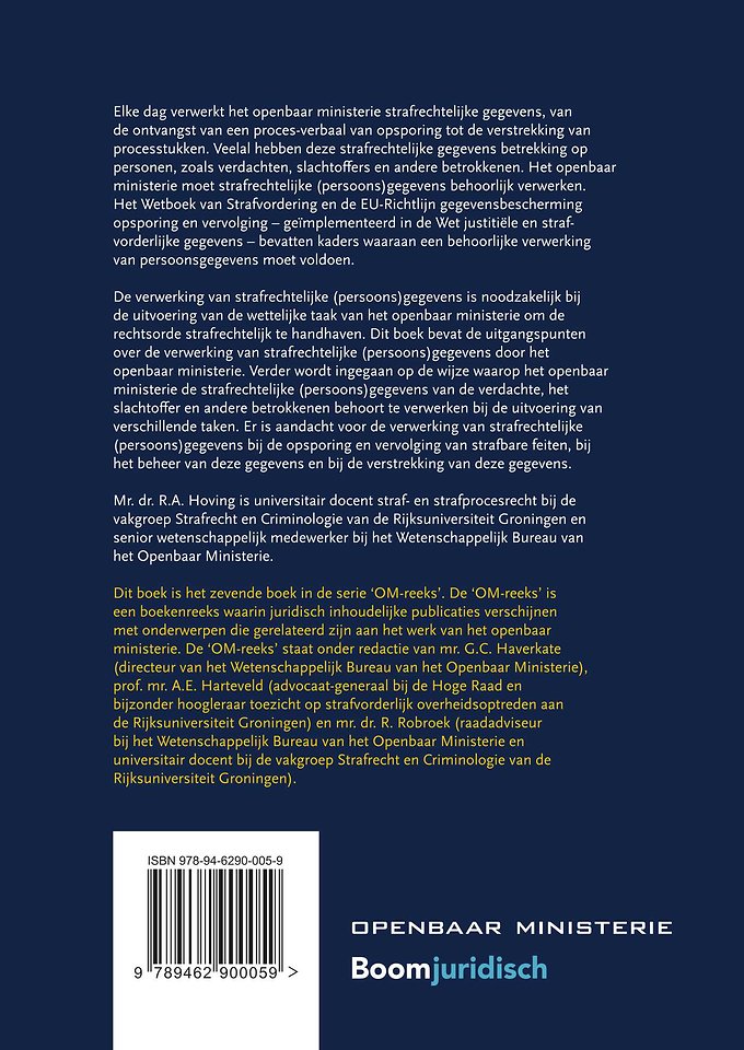 De verwerking van strafrechtelijke (persoons)gegevens is noodzakelijk bij de uitvoering van de wettelijke taak van het openbaar ministerie om de rechtsorde strafrechtelijk te handhaven. Dit boek bevat de uitgangspunten over de verwerking van strafrechtelijke (persoons)gegevens door het openbaar ministerie. Verder wordt ingegaan op de wijze waarop het openbaar ministerie de strafrechtelijke (persoons)gegevens van de verdachte, het slachtoffer en andere betrokkenen behoort te verwerken bij de uitvoering van verschillende taken. Er is aandacht voor de verwerking van strafrechtelijke (persoons)gegevens bij de opsporing en vervolging van strafbare feiten, bij het beheer van deze gegevens en bij de verstrekking van deze gegevens.