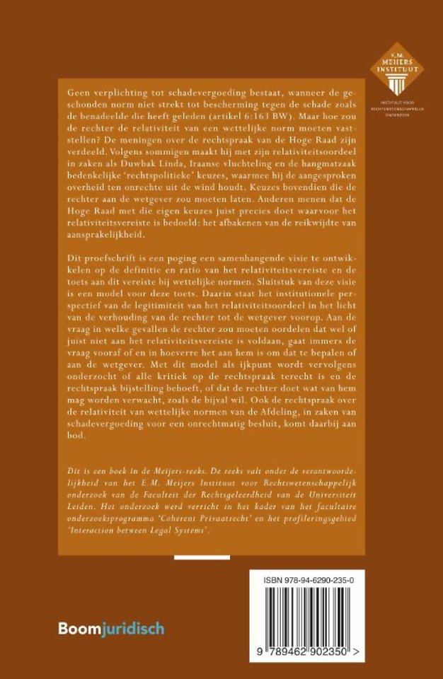 Dit proefschrift is een poging een samenhangende visie te ontwikkelen op de definitie en ratio van het relativiteitsvereiste en de toets aan dit vereiste bij wettelijke normen. Sluitstuk van deze visie is een model voor deze toets. Daarin staat het institutionele perspectief van de legitimiteit van het relativiteitsoordeel in het licht van de verhouding van de rechter tot de wetgever voorop. Aan de vraag in welke gevallen de rechter zou moeten oordelen dat wel of juist niet aan het relativiteitsvereiste is voldaan, gaat immers de vraag vooraf of en in hoeverre het aan hem is om dat te bepalen of aan de wetgever. Met dit model als ijkpunt wordt ver volgens onderzocht of alle kritiek op de rechtspraak terecht is en de rechtspraak bijstelling behoeft, of dat de rechter doet wat van hem mag worden verwacht, zoals de bijval wil. Ook de rechtspraak over de relativiteit van wettelijke normen van de Afdeling, in zaken van schadevergoeding voor een onrechtmatig besluit, komt daarbij aan bod.