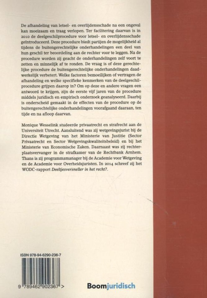 De vraag is of deze gerechtelijke procedure de buitengerechtelijke onderhandelingen daadwerkelijk verbetert. Welke factoren bemoeilijken of vertragen de afhandeling en welke specifieke kenmerken van de deelgeschilprocedure grijpen daarop in? Om op deze en andere vragen een antwoord te krijgen, zijn de eerste vijf jaren van de procedure middels juridisch en empirisch onderzoek geanalyseerd. Daarbij is onderscheid gemaakt in de effecten van de procedure op de buitengerechtelijke onderhandelingen voorafgaand daaraan, ten tijde en na afloop daarvan.
