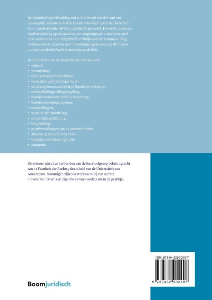 In Casuïstiek fiscale behandeling van de DGA wordt aan de hand van omvangrijk oefenmateriaal de fiscale behandeling van de DGA inzichtelijk gemaakt. Het oefenmateriaal heeft betrekking op de stand van de wetgeving per 1 december 2016 en is voorzien van een uitgebreide richtlijn voor de beantwoording. Het boek bevat opgaven met uitwerkingen gebaseerd op de theorie uit het studieboek Fiscale behandeling van de DGA.