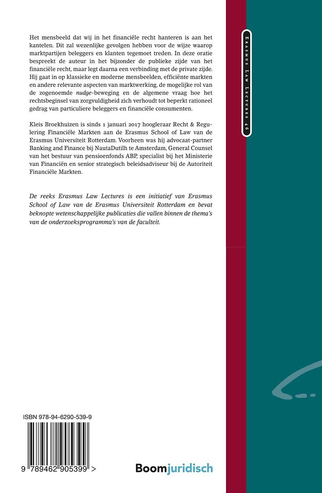 Het mensbeeld dat wij in het financiële recht hanteren is aan het kantelen. Dit zal wezenlijke gevolgen hebben voor de wijze waarop marktpartijen beleggers en klanten tegemoet treden. In deze oratie bespreekt de auteur in het bijzonder de publieke zijde van het financiële recht, maar legt daarna een verbinding met de private zijde.