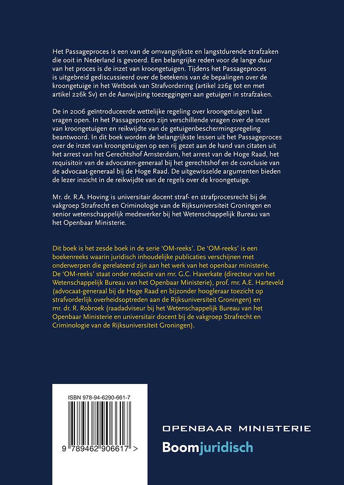 De in 2006 geïntroduceerde wettelijke regeling over kroongetuigen laat vragen open. In het Passageproces zijn verschillende vragen over de inzet van kroongetuigen en reikwijdte van de getuigenbeschermingsregeling beantwoord. In dit boek worden de belangrijkste lessen uit het Passageproces over de inzet van kroongetuigen op een rij gezet aan de hand van citaten uit het arrest van het Gerechtshof Amsterdam, het arrest van de Hoge Raad, het requisitoir van de advocaten-generaal bij het gerechtshof en de conclusie van de advocaat-generaal bij de Hoge Raad. De uitgewisselde argumenten bieden de lezer inzicht in de reikwijdte van de regels over de kroongetuige.