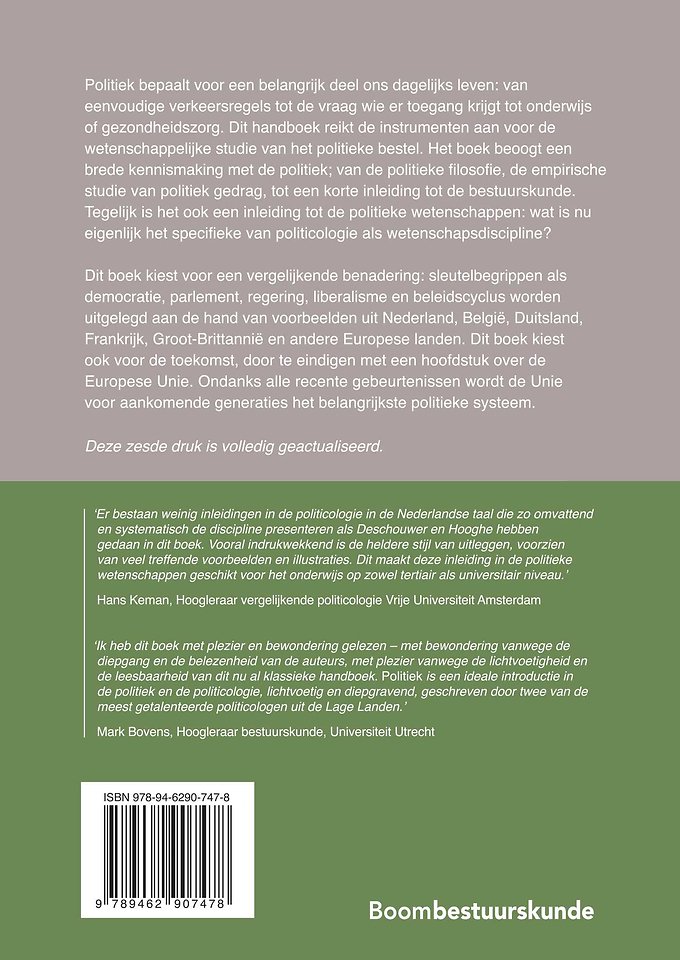 Politiek bepaalt voor een belangrijk deel ons dagelijks leven: van eenvoudige verkeersregels, tot de vraag wie er toegang krijgt tot onderwijs of gezondheidszorg. Dit handboek reikt de instrumenten aan voor de wetenschappelijke studie van het politieke bestel. Het boek beoogt een brede kennismaking met de politiek; van de politieke filosofie, de empirische studie van politiek gedrag tot een korte inleiding tot de bestuurskunde. Tegelijk is het ook een inleiding tot de politieke wetenschappen: wat is nu eigenlijk het specifieke van politicologie als wetenschapsdiscipline?