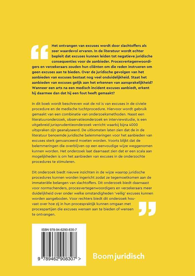 In dit boek wordt beschreven wat de rol is van excuses in de civiele procedure en de medische tuchtprocedure. Hiervoor wordt gebruik gemaakt van een combinatie van onderzoeksmethoden. Naast een literatuuronderzoek, observatieonderzoek en interviewstudie, is een uitgebreid jurisprudentieonderzoek verricht waarbij bijna 4000 uitspraken zijn geanalyseerd. De uitkomsten laten zien dat de in de literatuur benoemde juridische belemmeringen voor het aanbieden van excuses sterk genuanceerd moeten worden. Voorts blijkt dat de belemmeringen die overblijven op een eenvoudige wijze weggenomen kunnen worden. Het onderzoek laat daarnaast zien dat er een scala aan mogelijkheden is om het aanbieden van excuses in de onderzochte procedures te stimuleren. Dit onderzoek biedt nieuwe inzichten in de wijze waarop juridische procedures kunnen worden ingericht zodat ze tegemoetkomen aan de immateriële belangen van slachtoffers.
