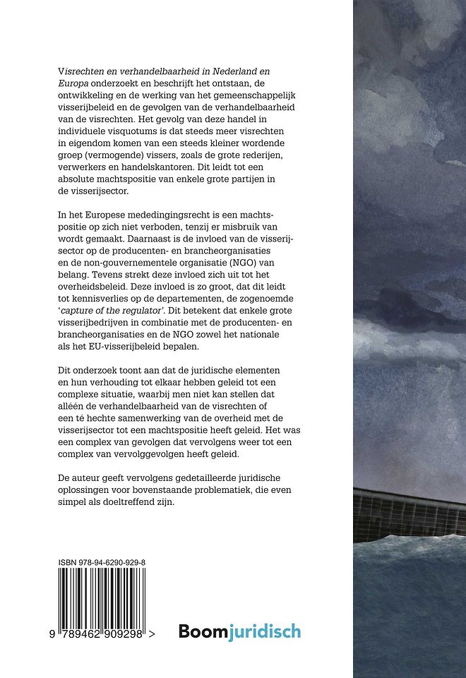 Visrechten en verhandelbaarheid in Nederland en Europa onderzoekt en beschrijft het ontstaan, de ontwikkeling en de werking van het gemeenschappelijk visserijbeleid en de gevolgen van de verhandelbaarheid van de visrechten. Het gevolg van deze handel in individuele visquotums is dat steeds meer visrechten in eigendom komen van een steeds kleiner wordende groep (vermogende) vissers, zoals de grote rederijen, verwerkers en handelskantoren. Dit leidt tot een absolute machtspositie van enkele grote partijen in de visserijsector.