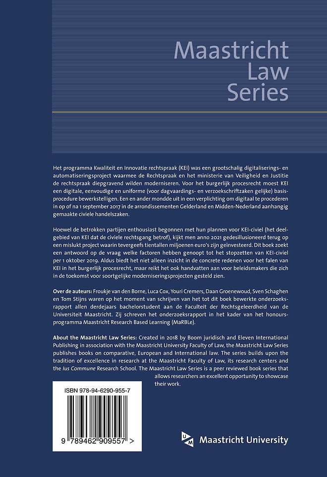 Hoewel de betrokken partijen enthousiast begonnen met hun plannen voor KEI-civiel (het deelgebied van KEI dat de civiele rechtsgang betrof), kijkt men anno 2021 gedesillusioneerd terug op een mislukt project waarin tevergeefs tientallen miljoenen euro’s zijn geïnvesteerd. Dit boek zoekt een antwoord op de vraag welke factoren hebben genoopt tot het stopzetten van KEI-civiel per 1 oktober 2019. Aldus biedt het niet alleen inzicht in de concrete redenen voor het falen van KEI in het burgerlijk procesrecht, maar reikt het ook handvatten aan voor beleidsmakers die zich in de toekomst voor soortgelijke moderniseringsprojecten gesteld zien.