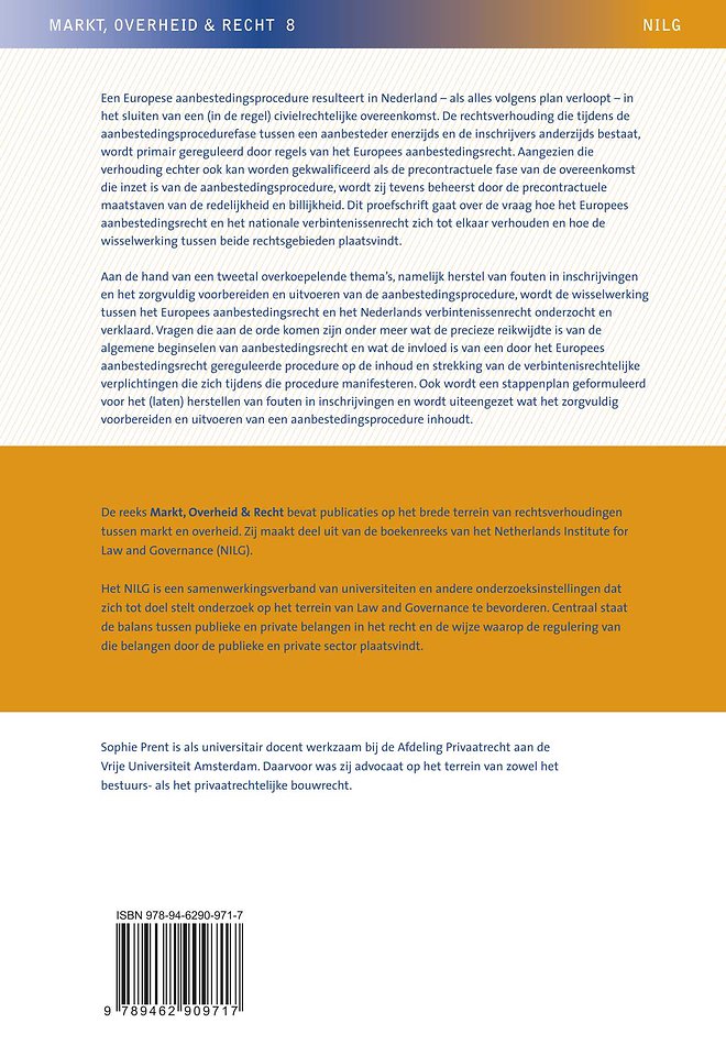 Aan de hand van een tweetal overkoepelende thema’s, namelijk herstel van fouten in inschrijvingen en het zorgvuldig voorbereiden en uitvoeren van de aanbestedingsprocedure, wordt de wisselwerking tussen het Europees aanbestedingsrecht en het Nederlands verbintenissenrecht onderzocht en verklaard. Vragen die aan de orde komen zijn onder meer wat de precieze reikwijdte is van de algemene beginselen van aanbestedingsrecht en wat de invloed is van een door het Europees aanbestedingsrecht gereguleerde procedure op de inhoud en strekking van de verbintenisrechtelijke verplichtingen die zich tijdens die procedure manifesteren. Ook wordt een stappenplan geformuleerd voor het (laten) herstellen van fouten in inschrijvingen en wordt uiteengezet wat het zorgvuldig voorbereiden en uitvoeren van een aanbestedingsprocedure inhoudt.