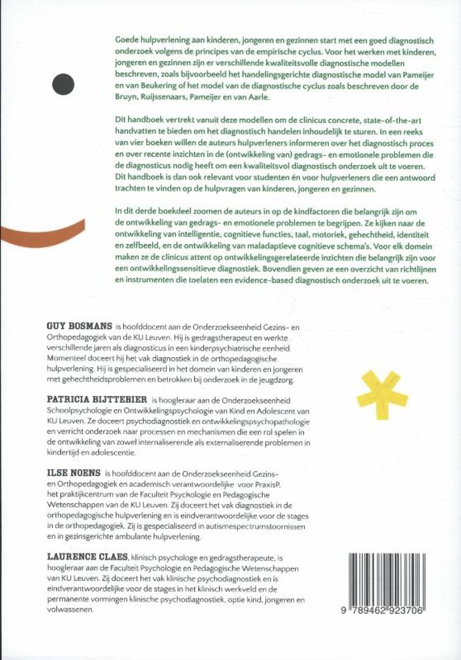 In dit derde boekdeel zoomen de auteurs in op de kindfactoren die belangrijk zijn om de ontwikkeling van gedrags- en emotionele problemen te begrijpen. Ze kijken naar de ontwikkeling van intelligentie, cognitieve functies, taal, motoriek, gehechtheid, identiteit en zelfbeeld, en de ontwikkeling van maladaptieve cognitieve schema's. Voor elk domein maken ze de clinicus attent op ontwikkelingsgerelateerde inzichten die belangrijk zijn voor een ontwikkelingssensitieve diagnostiek. Bovendien geven ze een overzicht van richtlijnen en instrumenten die toelaten een evidence-based diagnostisch onderzoek uit te voeren.