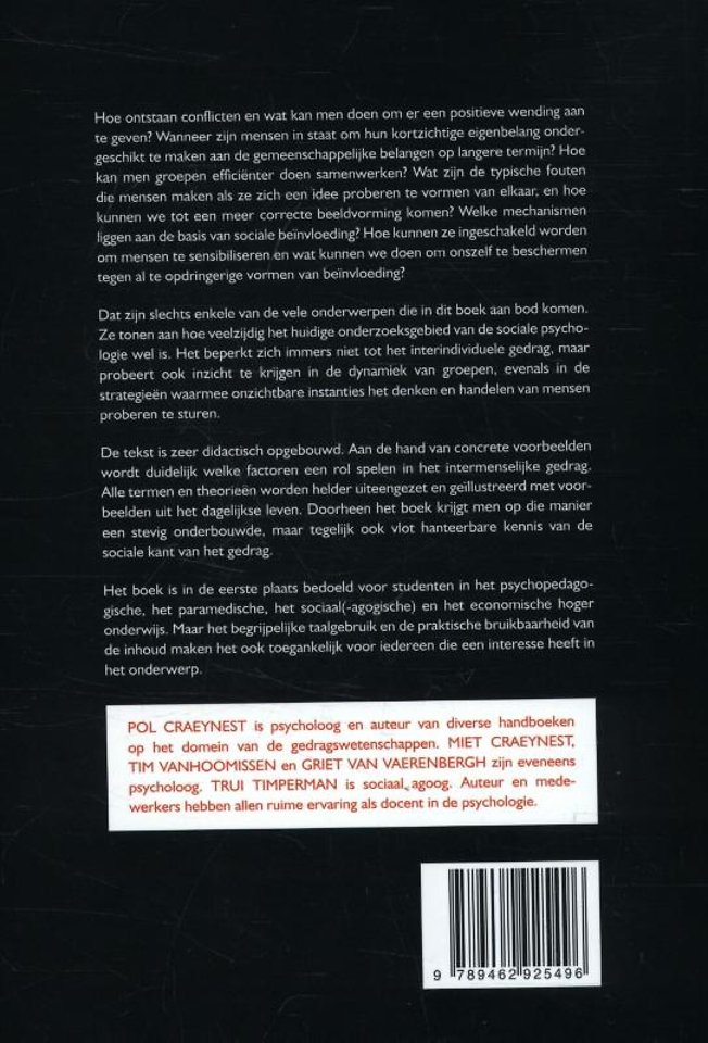 Dat zijn slechts enkele van de vele onderwerpen die in dit boek aan bod komen. Ze tonen aan hoe veelzijdig het huidige onderzoeksgebied van de sociale psychologie wel is. Het beperkt zich immers niet tot het interindividuele gedrag, maar probeert ook inzicht te krijgen in de dynamiek van groepen, evenals in de strategieën waarmee onzichtbare instanties het denken en handelen van mensen proberen te sturen.