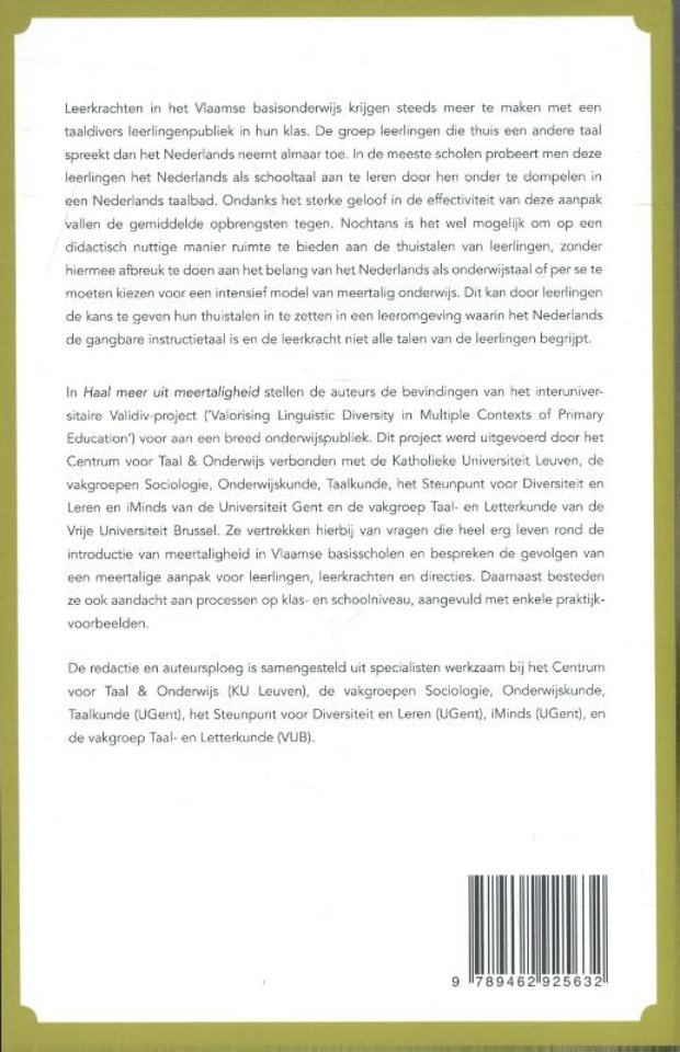 In Haal meer uit meertaligheid stellen de auteurs de bevindingen van het interuniversitaire Validiv-project ('Valorising Linguistic Diversity in Multiple Contexts of Primary Education') voor aan een breed onderwijspubliek. Dit project werd uitgevoerd door het Centrum voor Taal & Onderwijs verbonden met de Katholieke Universiteit Leuven, de vakgroepen Sociologie, Onderwijskunde, Taalkunde, het Steunpunt voor Diversiteit en Leren en iMinds van de Universiteit Gent en de vakgroep Taal- en Letterkunde van de Vrije Universiteit Brussel. Ze vertrekken hierbij van vragen die heel erg leven rond de introductie van meertaligheid in Vlaamse basisscholen en bespreken de gevolgen van een meertalige aanpak voor leerlingen, leerkrachten en directies. Daarnaast besteden ze ook aandacht aan processen op klas- en schoolniveau, aangevuld met enkele praktijkvoorbeelden.