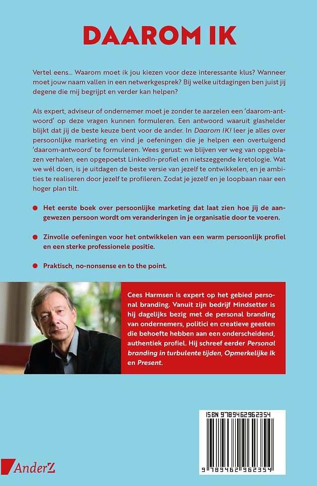 Als expert, adviseur of ondernemer moet je zonder te aarzelen een ‘daarom-antwoord’ op deze vragen kunnen formuleren. Een antwoord waaruit glashelder blijkt dat jij de beste keuze bent voor de ander. In 'Daarom IK!' leer je alles over persoonlijke marketing en vind je oefeningen die je helpen een overtuigend ‘daarom-antwoord’ te formuleren. Wees gerust: we blijven ver weg van opgeblazen verhalen, een opgepoetst LinkedIn-profiel en nietszeggende kretologie. Wat we wél doen, is je uitdagen de beste versie van jezelf te ontwikkelen, en je ambities te realiseren door jezelf te profileren. Zodat je jezelf en je loopbaan naar een hoger plan tilt.