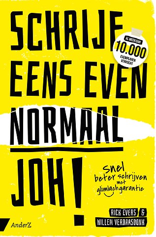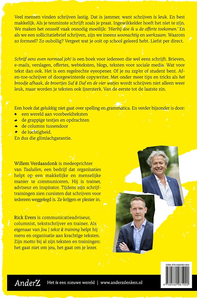 Schrijf eens even normaal, joh! is een boek voor iedereen die wel eens schrijft. Brieven, e-mails, verslagen, offertes, webteksten, blogs, teksten voor sociale media. Wat voor tekst dan ook. Het is een regelrechte eyeopener. Of je nu zzp’er of student bent. Af-en-toe-schrijver of doorgewinterde copywriter. Met onder meer tips en tricks als het broodje afhaak, de broertjes Suf & Duf en de vier watjes wordt schrijven niet alleen weer leuk, maar worden je teksten ook ijzersterk. Van de eerste tot de laatste zin.