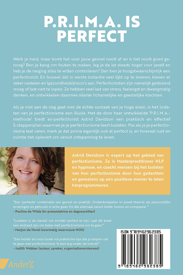 Preview - PRIMA is Perfect - In 5 stappen je perfectionisme loslaten Astrid Davidzon 2 maart 2016 Hoewel perfectionisme je in eerste instantie veel lijkt op te leveren, kleven er in de werkelijkheid veel nadelen en (gezondheids)risico's aan. Astrid Davidzon schreef een boek over hoe je daarmee om kunt gaan. In deze preview legt ze uit waarom dat belangrijk is. Lees het volledige artikel
