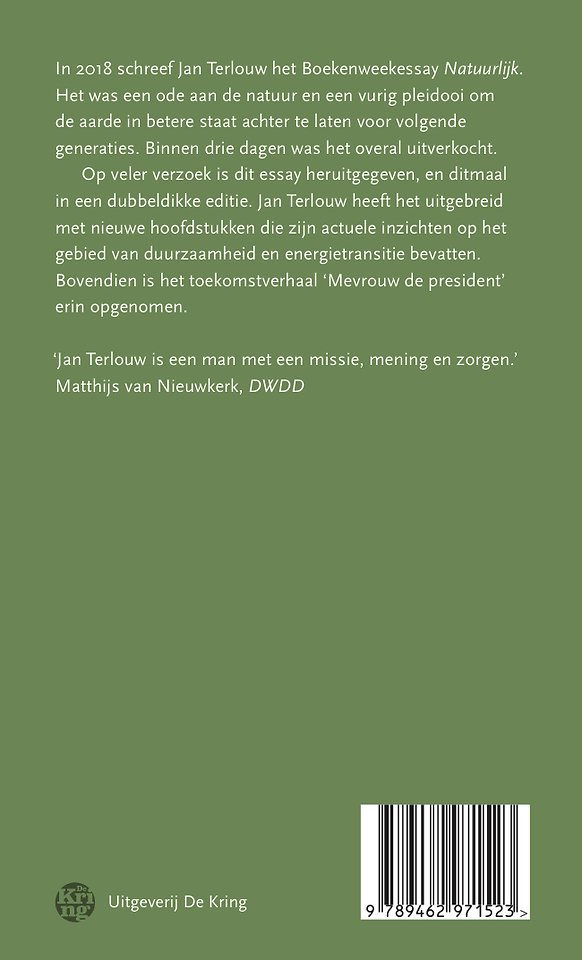 Op veler verzoek is dit essay heruitgegeven, en ditmaal in een meer dan dubbeldikke editie. Jan Terlouw heeft het uitgebreid met nieuwe hoofdstukken die zijn actuele inzichten op het gebied van duurzaamheid en energietransitie bevatten. Bovendien is het toekomstverhaal 'Mevrouw de president' erin opgenomen.