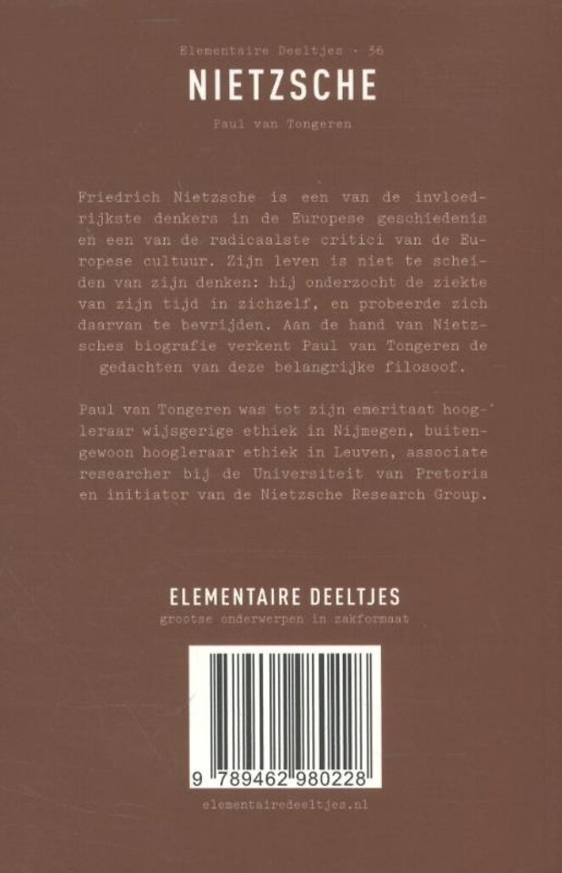Friedrich Nietzsche is een van de invloedrijkste denkers in de Europese geschiedenis en een van de radicaalste critici van de Europese cultuur. Zijn leven is niet te scheiden van zijn denken: hij onderzocht de ziekte van zijn tijd in zichzelf, en probeerde zich daarvan te bevrijden. Daarom wordt in dit boek zijn denken verkend aan de hand van zijn biografie. de ontwikkeling van klassiek filoloog tot filosofisch cultuurcriticus, van de vrije geest en zijn 'wandelboeken' op weg naar het filosofisch hoogtepunt van zijn leven: zijn doordenking en doorleving van het Europese nihilisme.