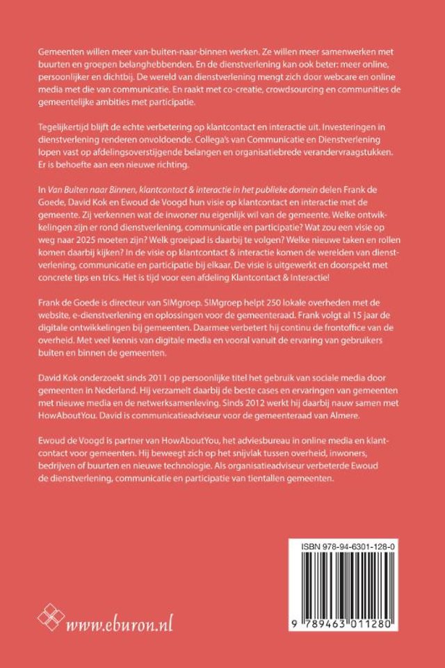 In 'Van Buiten naar Binnen, klantcontact & interactie in het publieke domein' delen Frank de Goede, David Kok en Ewoud de Voogd hun visie op klantcontact en interactie met de gemeente. Zij verkennen wat de inwoner nu eigenlijk wil van de gemeente. Welke ontwikkelingen zijn er rond dienstverlening, communicatie en participatie? Wat zou een visie op weg naar 2025 moeten zijn? Welk groeipad is daarbij te volgen? Welke nieuwe taken en rollen komen daarbij kijken? In de visie op klantcontact & interactie komen de werelden van dienstverlening, communicatie en participatie bij elkaar. De visie is uitgewerkt en doorspekt met concrete tips en trics. Het is tijd voor een afdeling Klantcontact & Interactie!