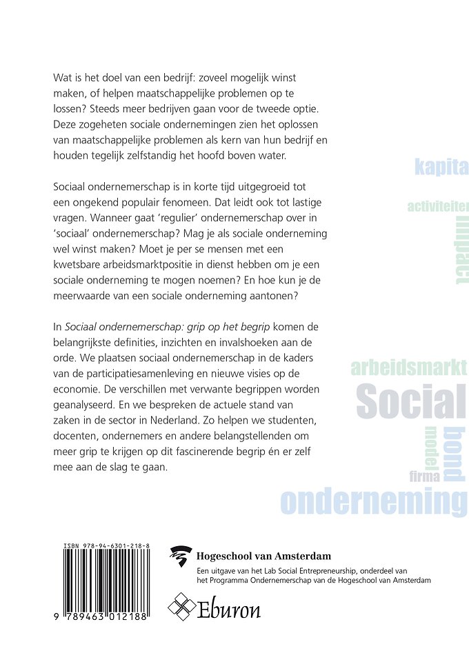 In Sociaal ondernemerschap: grip op het begrip komen de belangrijkste definities, inzichten en invalshoeken aan de orde. We plaatsen sociaal ondernemerschap in de kaders van de participatiesamenleving en nieuwe visies op de economie. De verschillen met verwante begrippen worden geanalyseerd. En we bespreken de actuele stand van zaken in de sector in Nederland. Zo helpen we studenten, docenten, ondernemers en andere belangstellenden om meer grip te krijgen op dit fascinerende begrip én er zelf mee aan de slag te gaan.