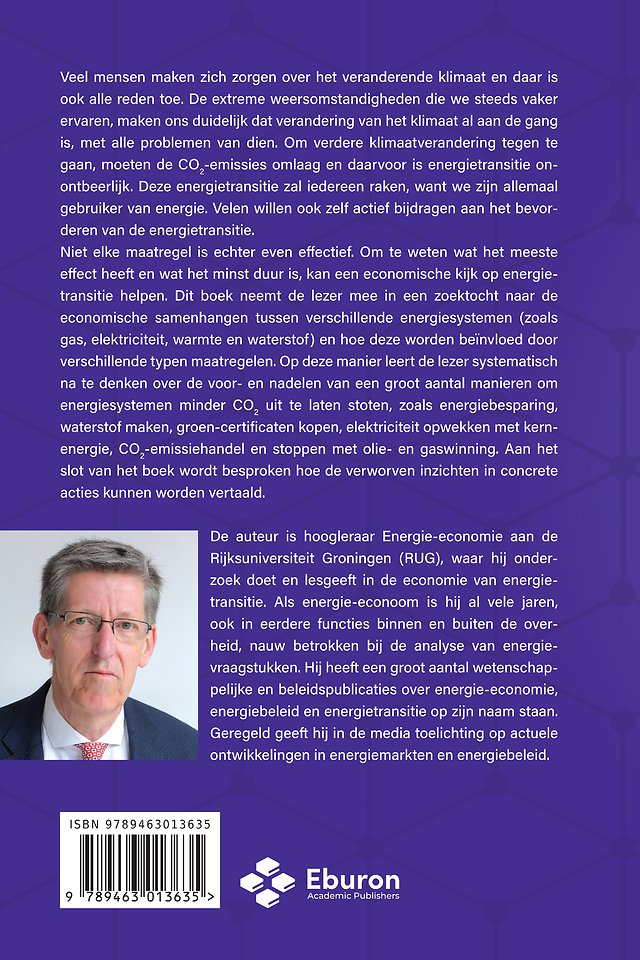 Niet elke maatregel is echter even effectief. Om te weten wat het meeste effect heeft en wat het minst duur is, kan een economische kijk op energietransitie helpen. Dit boek neemt de lezer mee in een zoektocht naar de economische samenhangen tussen verschillende energiesystemen (zoals gas, elektriciteit, warmte en waterstof) en hoe deze worden beïnvloed door verschillende typen maatregelen. Op deze manier leert de lezer systematisch na te denken over de voor- en nadelen van een groot aantal manieren om energiesystemen minder CO2 uit te laten stoten, zoals energiebesparing, waterstof maken, groen-certificaten kopen, elektriciteit opwekken met kernenergie, CO2-emissiehandel en stoppen met olie- en gaswinning. Aan het slot van het boek wordt besproken hoe de verworven inzichten in concrete acties kunnen worden vertaald.