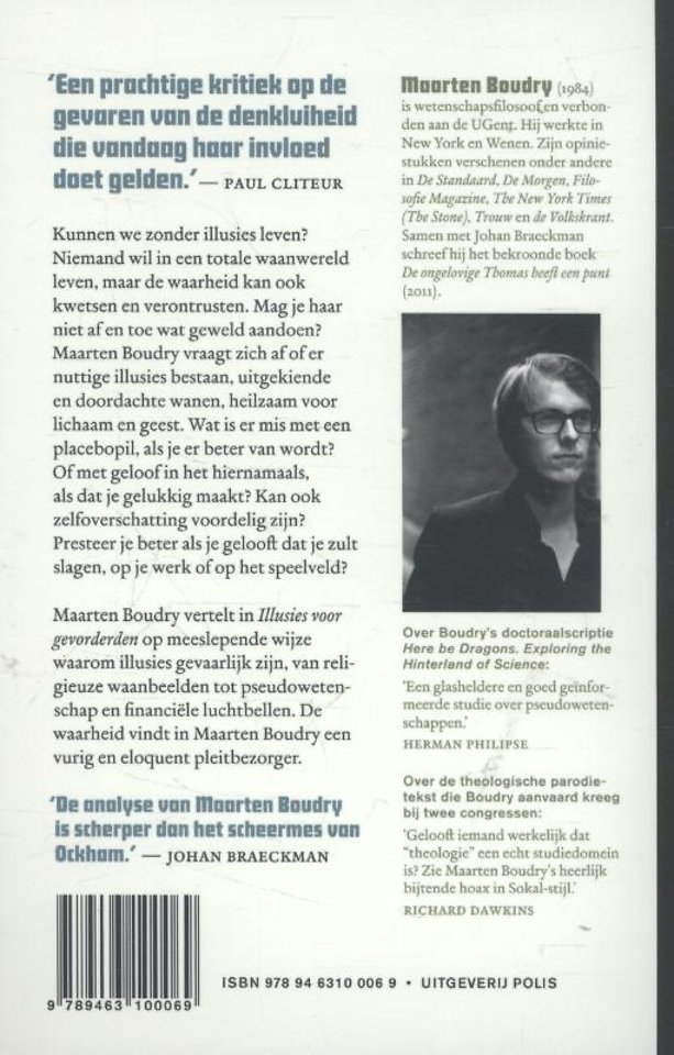 Kunnen we zonder illusies? Niemand wil in een totale waanwereld leven, maar de waarheid kan ook kwetsen en verontrusten. Mag je haar niet af en toe wat geweld aandoen? Maarten Boudry vraagt zich af of er nuttige illusies bestaan, uitgekiende en doordachte wanen, heilzaam voor lichaam en geest. Wat is er mis met een placebopil, als je er beter van wordt? Of met geloof in het hiernamaals, als dat je gelukkig maakt? Kan ook zelfoverschatting nuttig zijn? Presteer je niet beter op je werk en op het speelveld als je gelooft dat je zult winnen? Maarten Boudry vertelt in Illusies voor gevorderden op meeslepende wijze hoe wetenschap veel van onze illusies over onszelf en de wereld heeft ontnomen. Kunnen we al die kennis wel aan? Mogen we onszelf en elkaar heilzame leugens aanpraten? Of zijn ook gevorderde illusies gevaarlijk? De waarheid vindt in Maarten Boudry een vurig en eloquent pleitbezorger. In een wereld van religieus fundamentalisme en financiële luchtbellen verwoordt hij de vragen die we ons vandaag moeten stellen.