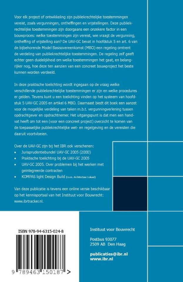 In deze praktische toelichting wordt ingegaan op de vraag welke verschillende publiekrechtelijke toestemmingen er zijn, en welke procedures er gelden. Tevens kunt u een toelichting vinden op het systeem van hoofdstuk 5 UAV-GC 2005 en artikel 6 MBO. Daarnaast biedt dit boek een aanzet voor de mogelijke verdeling van taken m.b.t. vergunningverlening tussen opdrachtgever en opdrachtnemer. Het uitgangspunt is dat men een handvat heeft om tot een (voor een concreet project) overzicht te komen van de toepasselijke publiekrechtelijke wet- en regelgeving en de vereisten die daaruit voortvloeien.