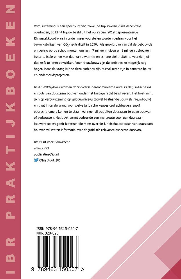 In dit Praktijkboek worden door diverse gerenommeerde auteurs de juridische ins en outs van duurzaam bouwen onder het huidige recht beschreven. Het boek richt zich op verduurzaming op gebouwniveau (zowel bestaande bouw als nieuwbouw) en gaat in op de vraag voor welke juridische keuzes opdrachtgevers en/of opdrachtnemers komen te staan wanneer zij besluiten duurzaam te gaan bouwen of verbouwen. Het boek vormt zodoende een marsroute voor een duurzaam bouwproces en geeft iedereen die meer over de juridische aspecten van duurzaam bouwen wil weten informatie over de juridisch relevante aspecten daarvan.
