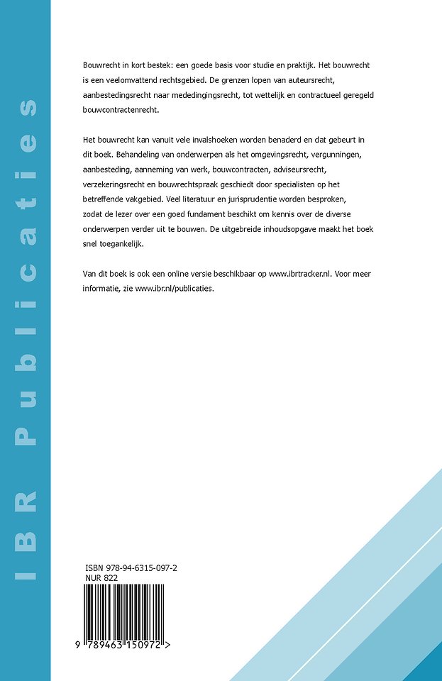 Het bouwrecht kan vanuit vele invalshoeken worden benaderd en dat gebeurt in dit boek. Behandeling van onderwerpen als het omgevingsrecht, vergunningen, aanbesteding, aanneming van werk, bouwcontracten, adviseursrecht, verzekeringsrecht en bouwrechtspraak geschiedt door specialisten op het betreffende vakgebied. Veel literatuur en jurisprudentie worden besproken, zodat de lezer over een goed fundament beschikt om kennis over de diverse onderwerpen verder uit te bouwen. De uitgebreide inhoudsopgave maakt het boek snel toegankelijk.