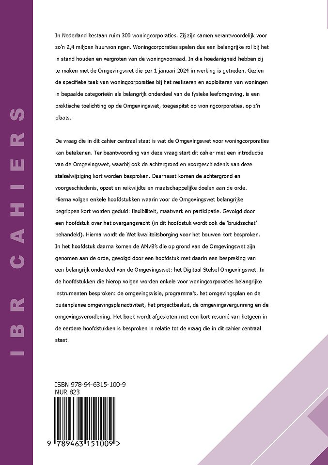 In Nederland bestaan ruim 300 woningcorporaties. Zij zijn samen verantwoordelijk voor zo’n 2,4 miljoen huurwoningen. Woningcorporaties spelen dus een belangrijke rol bij het in stand houden en vergroten van de woningvoorraad. In die hoedanigheid hebben zij te maken met de Omgevingswet die per 1 januari 2024 in werking is getreden. Gezien de specifieke taak van woningcorporaties bij het realiseren en exploiteren van woningen in bepaalde categorieën als belangrijk onderdeel van de fysieke leefomgeving, is een praktische toelichting op de Omgevingswet, toegespitst op woningcorporaties, op z’n plaats.
