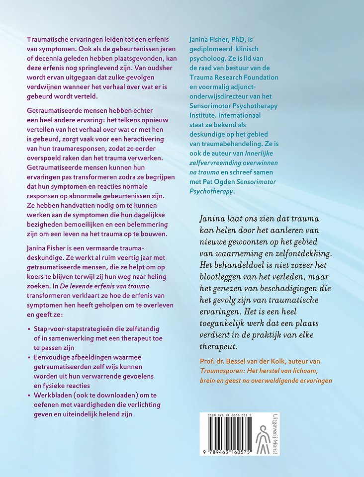Janina Fisher is een vermaarde traumadeskundige. Ze werkt al ruim veertig jaar met getraumatiseerde mensen, die ze helpt om op koers te blijven terwijl zij hun weg naar heling zoeken. In 'De levende erfenis van trauma transformeren' verklaart ze hoe de erfenis van symptomen hen heeft geholpen om te overleven en geeft ze: