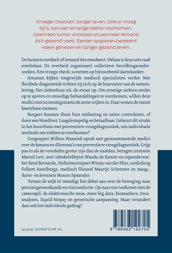 Zorgpublicist Willem Wansink sprak gerenommeerde medici over de kansen en dilemma’s van preventieve vroegdiagnostiek. Internist Marcel Levi, anti-tabakslobbyist Wanda de Kanter en toponderzoeker René Bernards, alzheimerexpert Wiesje van der Flier, hoogleraar cardiologie Folkert Asselbergs, medisch filosoof Maartje Schermer en maag-, darm- en leverarts Manon Spaander.