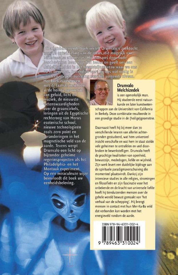 Dit adembenemende boek vertelt Drunvalo's zoektocht naar de ontwikkeling van de mens, die mogelijk van buitenaardse afkomst is. Hij leidt ons door oude beschavingen heen naar het heden en geeft ons een duidelijk inzicht in het bewustzijnsniveau waar we ons nu in bevinden. Bovendien leert hij ons wat nodig is voor een soepele overgang naar het volgende niveau. Het boek is verweven met de laatste inzichten in de heilige geometrie van geluid, licht en muziek, de nieuwste wetenswaardigheden over de graancirkels, leringen uit de Egyptische rechteroog van Horus esoterische school, nieuwe technologieën zoals zero point en veranderingen in het magnetische veld van de aarde. Tevens werpt Drunvalo een licht op bijzonder geheime regeringsprojecten als het Philadelphia- en het Montauk-experiment. Op een miraculeuze wijze beïnvloedt dit boek uw eenheidsbeleving.