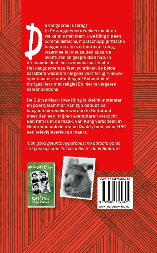 Ze zijn er weer! In het vorig jaar verschenen De kangoeroekroniekenmaakten we kennis met Marc-Uwe Kling die een communistische, maatschappijkritische kangoeroe als over-buurman kreeg. In een afgeladen Boom Chicago in Amsterdam werd de vertaling van hun niet zelden absurde avonturen en gesprekken gepresenteerd. Online zijn beelden terug te zien van deze historische avond. In dit tweede deel, het eveneens satirische Het kangoeroemanifest, schrikken de beide karakters wederom nergens voor terug. Nieuwe spectaculaire onthullingen! Schandalen! Intriges! Iets met religie! En niet te vergeten kersenbonbons.