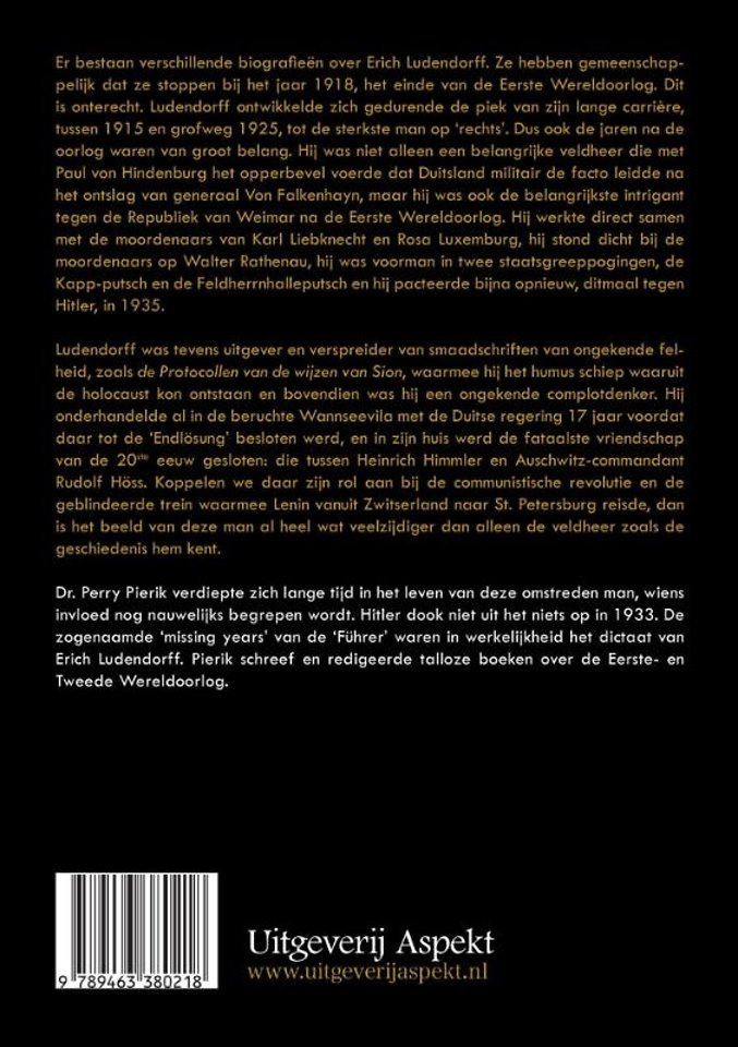 Ludendorff was tevens uitgever en verspreider van smaadschriften van ongekende felheid, zoals de Protocollen van de wijzen van Sion, waarmee hij het humus schiep waaruit de holocaust kon ontstaan en bovendien was hij een ongekende complotdenker. Hij onderhandelde al in de beruchte Wannseevila met de Duitse regering 17 jaar voordat daar tot de 'Endlösung' besloten werd, en in zijn huis werd de fataalste vriendschap van de 20ste eeuw gesloten: die tussen Heinrich Himmler en Auschwitz-commandant Rudolf Höss. Koppelen we daar zijn rol aan bij de communistische revolutie en de geblindeerde trein waarmee Lenin vanuit Zwitserland naar St. Petersburg reisde, dan is het beeld van deze man al heel wat veelzijdiger dan alleen de veldheer zoals de geschiedenis hem kent.