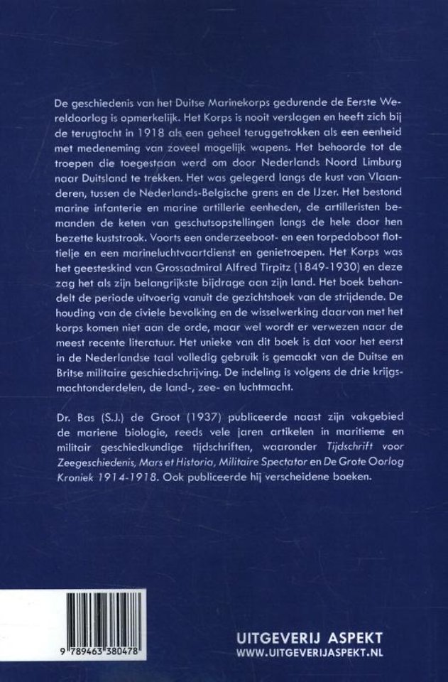 De geschiedenis van het Duitse Marinekorps gedurende de Eerste We-reldoorlog is opmerkelijk. Het Korps is nooit verslagen en heeft zich bij de terugtocht in 1918 als een geheel teruggetrokken als een eenheid met medeneming van zoveel mogelijk wapens. Het behoorde tot de troepen die toegestaan werd om door Nederlands Noord Limburg naar Duitsland te trekken. Het was gelegerd langs de kust van Vlaan-deren, tussen de Nederlands-Belgische grens en de IJzer. Het bestond marine infanterie en marine artillerie eenheden, de artilleristen be-manden de keten van geschutsopstellingen langs de hele door hen bezette kuststrook. Voorts een onderzeeboot- en een torpedoboot flot-tielje en een marineluchtvaartdienst en genietroepen. Het Korps was het geesteskind van Grossadmiral Alfred Tirpitz (1849-1930) en deze zag het als zijn belangrijkste bijdrage aan zijn land. Het boek behan-delt de periode uitvoerig vanuit de gezichtshoek van de strijdende. De houding van de civiele bevolking en de wisselwerking daarvan met het korps komen niet aan de orde, maar wel wordt er verwezen naar de meest recente literatuur. Het unieke van dit boek is dat voor het eerst in de Nederlandse taal volledig gebruik is gemaakt van de Duitse en Britse militaire geschiedschrijving. De indeling is volgens de drie krijgs-machtonderdelen, de land-, zee- en luchtmacht.