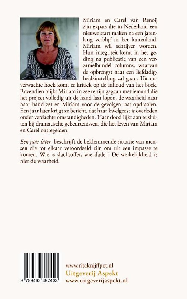 Miriam en Carel van Renoij zijn expats die in Nederland een nieuwe start maken na een jarenlang verblijf in het buitenland. Miriam wil schrijver worden. Hun integriteit komt in het geding na publicatie van een verzamelbundel columns, waarvan de opbrengst naar een liefdadigheidsinstelling zal gaan. Uit onverwachte hoek komt er kritiek op de inhoud van het boek. Bovendien blijkt Miriam in zee te zijn gegaan met iemand die het project volledig uit de hand laat lopen, de waarheid naar haar hand zet en Miriam voor de gevolgen laat opdraaien. Een jaar later krijgt ze bericht, dat haar kwelgeest is overleden onder verdachte omstandigheden. Haar dood lijkt aan te sluiten bij dramatische gebeurtenissen, die het leven van Miriam en Carel ontregelden.