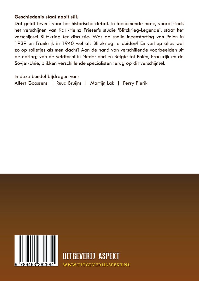 Dat geldt tevens voor het historische debat. In toenemende mate, vooral sinds het verschijnen van Karl-Heinz Frieser’s studie ‘Blitzkrieg-Legende’, staat het verschijnsel Blitzkrieg ter discussie. Was de snelle ineenstorting van Polen in 1939 en Frankrijk in 1940 wel als Blitzkrieg te duiden? En verliep alles wel zo op rolletjes als men dacht? Aan de hand van verschillende voorbeelden uit de oorlog; van de veldtocht in Nederland en België tot Polen, Frankrijk en de Sovjet-Unie, blikken verschillende specialisten terug op dit verschijnsel.