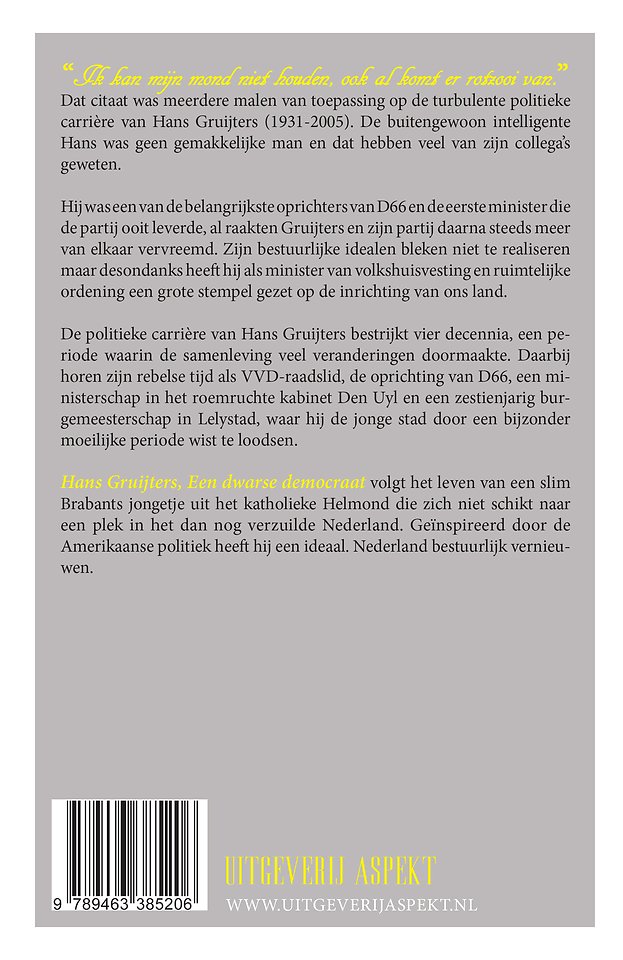 Hans Gruijters, Een dwarse democraat volgt het leven van een slim Brabants jongetje uit het katholieke Helmond die zich niet schikt naar een plek in het dan nog verzuilde Nederland. Geïnspireerd door de Amerikaanse politiek heeft hij een ideaal. Nederland bestuurlijk vernieuwen.