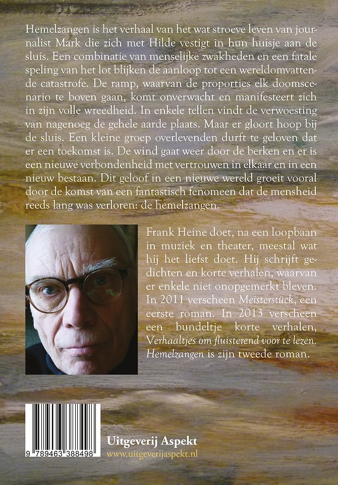 Frank Heine doet, na een loopbaan in muziek en theater, meestal wat hij het liefst doet. Hij schrijft gedichten en korte verhalen, waarvan er enkele niet onopgemerkt bleven. In 2011 verscheen Meisterstück, een eerste roman. In 2013 verscheen een bundeltje korte verhalen, Verhaaltjes om fluisterend voor te lezen. Hemelzangen is zijn tweede roman.