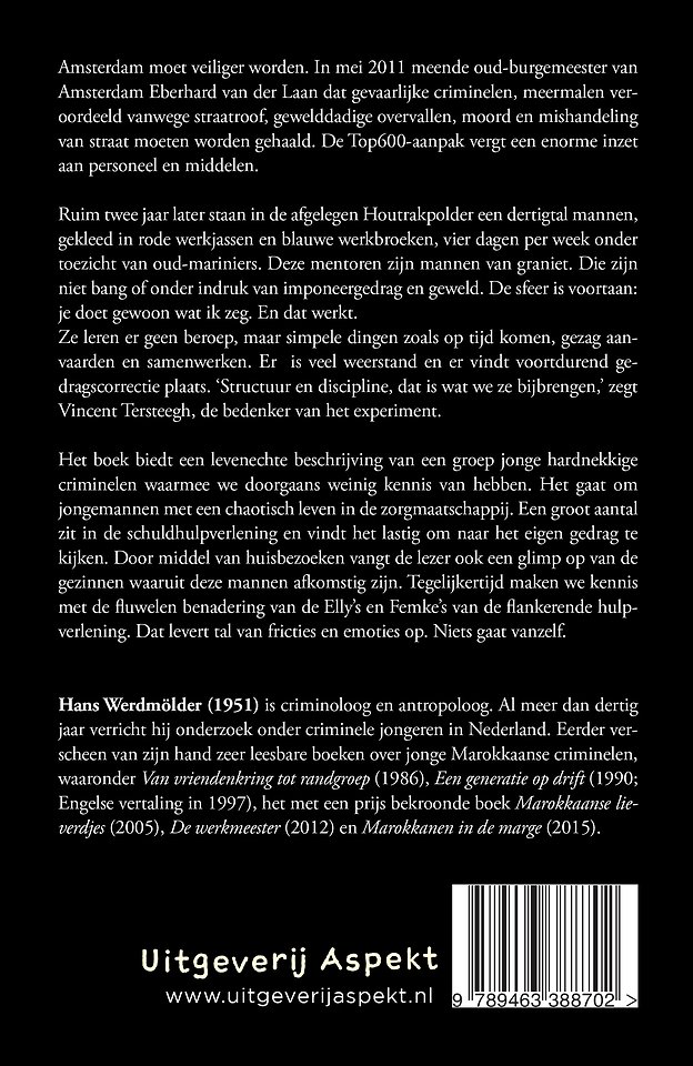 Hans Werdmölder (1951) is criminoloog en antropoloog. Al meer dan dertig jaar verricht hij onderzoek onder criminele jongeren in Nederland. Eerder verscheen van zijn hand zeer leesbare boeken over jonge Marokkaanse criminelen, waaronder Van vriendenkring tot randgroep (1986), Een generatie op drift (1990; Engelse vertaling in 1997), het met een prijs bekroonde boek Marokkaanse lieverdjes (2005), De werkmeester (2012) en Marokkanen in de marge (2015).