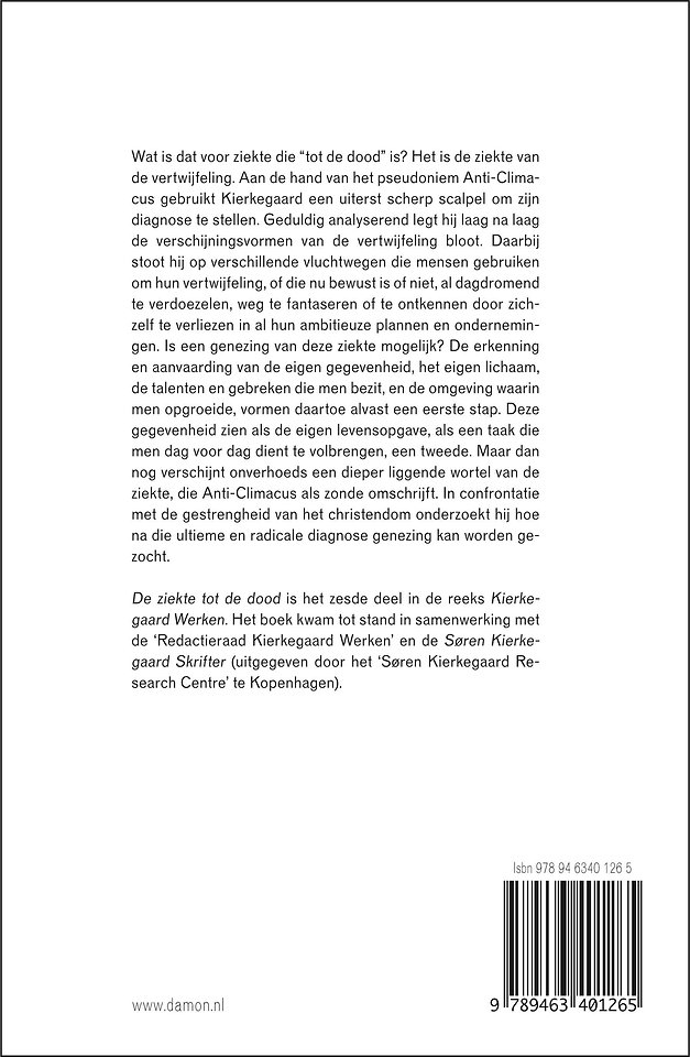 'De ziekte tot de dood' vormt het zesde deel in de serie 'Kierkegaard Werken'. Het boek wordt uitgegeven in samenwerking met de 'Redactieraad Kierkegaard Werken' (www.kierkegaard.be) en de Søren Kierkegaard Skrifter (uitgegeven door het 'Søren Kierkegaard Research Centre' te Kopenhagen, www.sk.ku.dk).
