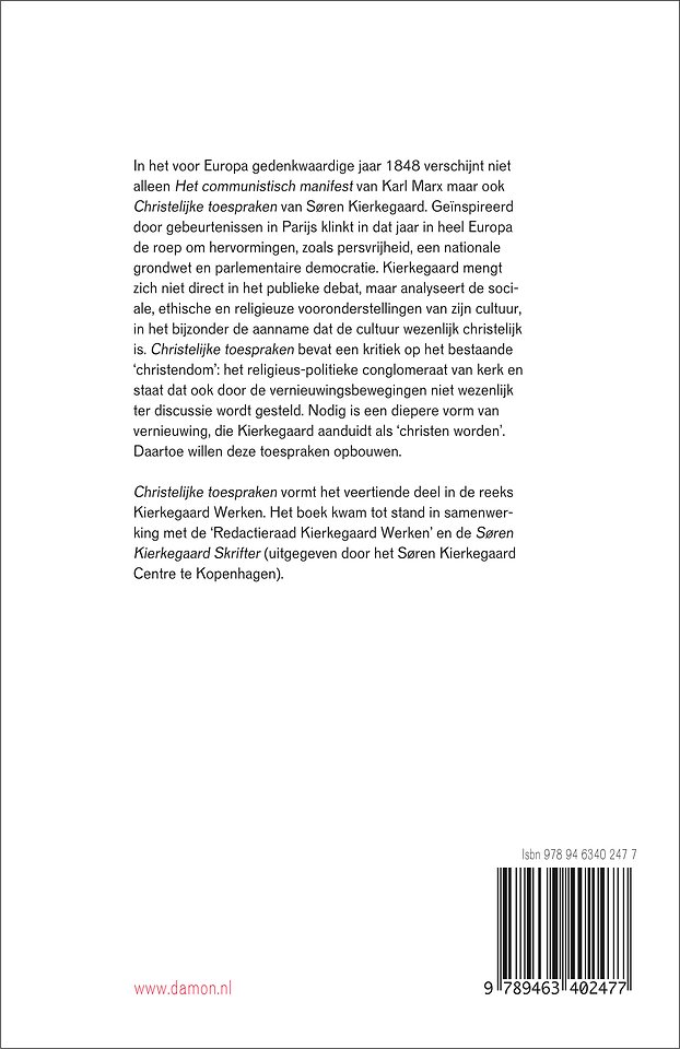 In het voor Europa gedenkwaardige jaar 1848 verschijnt niet alleen Het communistisch manifest van Karl Marx maar ook 'Christelijke toespraken' van Søren Kierkegaard. Geïnspireerd door gebeurtenissen in Parijs klinkt in dat jaar in heel Europa de roep om hervormingen, zoals persvrijheid, een nationale grondwet en parlementaire democratie. Kierkegaard mengt zich niet direct in het publieke debat, maar analyseert de sociale, ethische en religieuze vooronderstellingen van zijn cultuur, in het bijzonder de aanname dat de cultuur wezenlijk christelijk is.