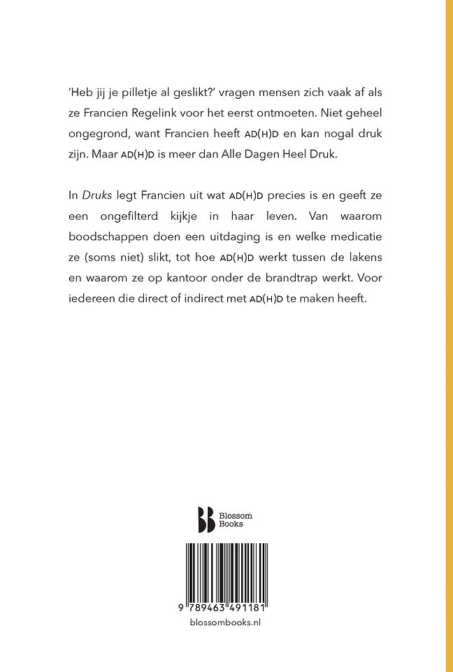 In 'Druks' legt Francien uit wat AD(H)D precies is en geeft ze een ongefilterd kijkje in haar leven. Van waarom boodschappen doen een uitdaging is en welke medicatie ze (soms niet) slikt, tot hoe AD(H)D werkt tussen de lakens en waarom ze op kantoor onder de brandtrap werkt. Voor iedereen die direct of indirect met AD(H)D te maken heeft.