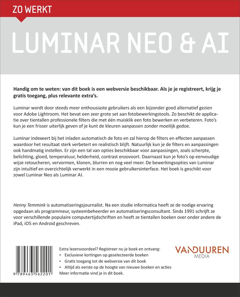 Luminar indexeert bij het inladen automatisch de foto en zal hierop de filters en effecten aanpassen, waardoor het resultaat sterk verbetert en realistisch blijft. Natuurlijk kun je de filters en aanpassingen ook handmatig instellen. Er zijn tal van opties beschikbaar voor aanpassingen, zoals scherpte, belichting, gloed, temperatuur, helderheid, contrast, enzovoort. Daarnaast kun je foto’s op eenvoudige wijze retoucheren, vervormen, klonen, vervagen en nog veel meer. De bewerkingsopties van Luminar zijn intuïtief en overzichtelijk verwerkt in een mooie gebruikersinterface. De laatste ontwikkelingen op het gebied van AI-technologie die Luminar ondersteunt worden in dit boek besproken.