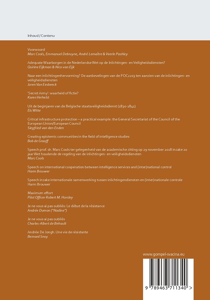 In dit cahier komt onder andere aan bod: de Nederlandse wet op de inlichtingen- en veiligheidsdiensten, een presentatie van twee masterproeven in de criminologische wetenschappen, de aanbevelingen van de parlementaire onderzoekscommissie naar de aanslagen van 22 maart 2016 op de inlichtingen- en veiligheidsdiensten, inzichten over de ontstaansgeschiedenis van de Belgische Veiligheid van de Staat, de speech van Marc Cools ter gelegenheid van de academische zitting op 29 november 2018 inzake 20 jaar Wet houdende de regeling van de inlichtingen- en veiligheidsdiensten alsook de speech inzake de internationale samenwerking tussen inlichtingendiensten en (inter)nationale controle van Harm Brouwer tijdens de BISC studiedag “International collaboration regarding intelligence services and intelligence studies” op 29 juni 2018.