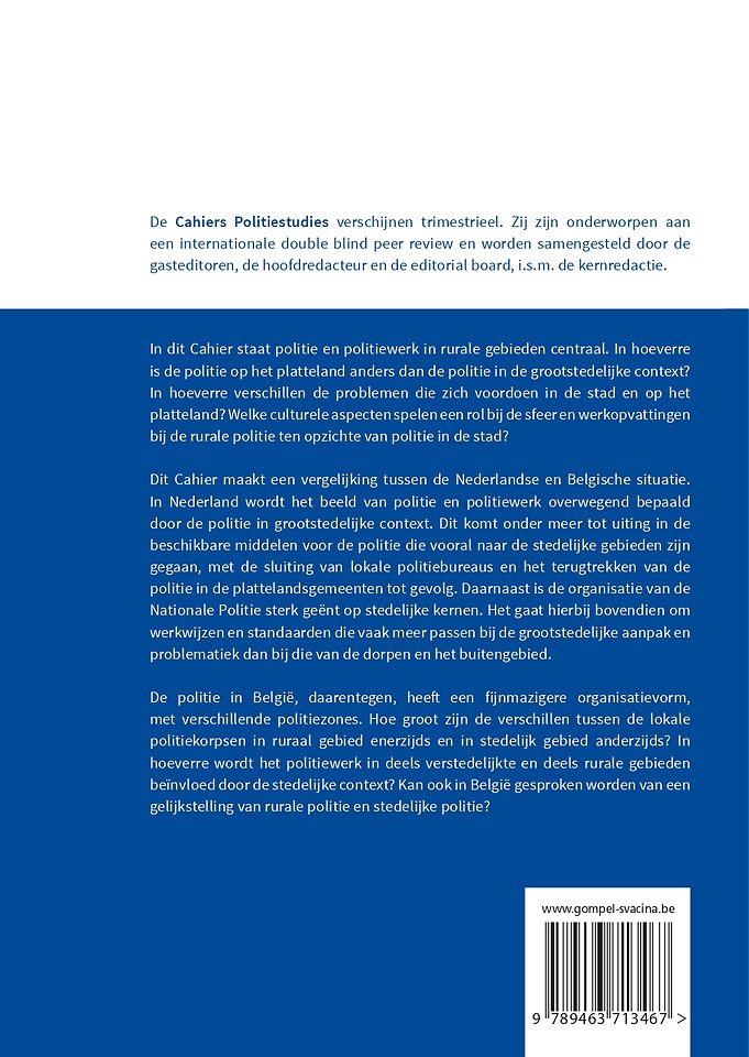Dit Cahier maakt een vergelijking tussen de Nederlandse en Belgische situatie. In Nederland wordt het beeld van politie en politiewerk overwegend bepaald door de politie in grootstedelijke context. Dit komt onder meer tot uiting in de beschikbare middelen voor de politie die vooral naar de stedelijke gebieden zijn gegaan, met de sluiting van lokale politiebureaus en het terugtrekken van de politie in de plattelandsgemeenten tot gevolg. Daarnaast is de organisatie van de Nationale Politie sterk geënt op stedelijke kernen. Het gaat hierbij bovendien om werkwijzen en standaarden die vaak meer passen bij de grootstedelijke aanpak en problematiek dan bij die van de dorpen en het buitengebied.